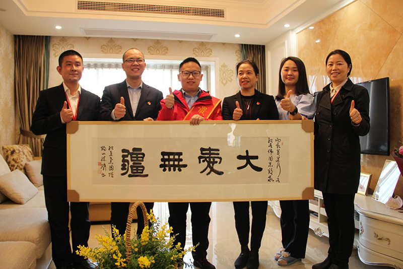 下午,紅豆集團常務(wù)副總裁、國際公司董事長戴敏君,集團品牌文化部部長錢文華率紅豆物業(yè)團隊來到殷晉偉家,上門送上最誠摯的慰問,贈予殷晉偉“大愛無疆”牌匾,代表紅豆集團全體員工向英雄表達崇高敬意!“大愛無疆”牌匾由中國書法家協(xié)會理事、無錫市國畫院院長孫璘先生親自揮毫書寫,筆鋒蒼勁有力,一筆一畫盡顯孫璘先生對“逆行英雄”的真情真意。