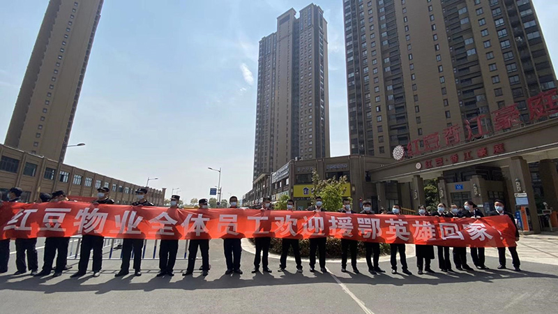 出征還是冬日,歸來已是花期。經(jīng)過70多天的奮戰(zhàn),武漢重啟,英雄凱旋。4月14日上午,紅豆香江豪庭小區(qū)援鄂英雄殷晉偉醫(yī)生凱旋回家,懷著對英雄的崇高敬意,紅豆物業(yè)全體員工早已列隊,手拿紅旗,拉起了歡迎條幅——“紅豆物業(yè)全體員工歡迎援鄂英雄回家”,在小區(qū)門口等候英雄的到來。