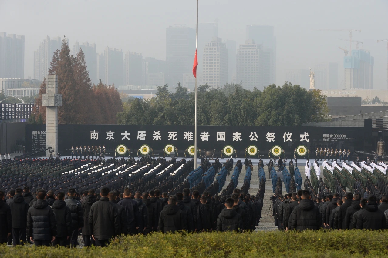 10時整,公祭儀式開始,奏唱《中華人民共和國國歌》。國歌唱畢,全場向南京大屠殺死難者默哀,南京市全城拉響防空警報,汽車停駛鳴笛,行人就地默哀。默哀畢,在解放軍軍樂團演奏的《國家公祭獻曲》的旋律中,解放軍儀仗大隊16名禮兵將8個花圈敬獻于公祭臺上。