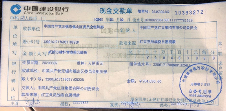眾志成城,方能共克時(shí)艱,為響應(yīng)黨中央、省委、市委、區(qū)委對(duì)廣大黨員的號(hào)召,助力全國(guó)共抗疫情,紅豆集團(tuán)廣大黨員干部迅速行動(dòng),踴躍捐款,用愛心凝聚合力,表達(dá)對(duì)新冠肺炎疫情防控工作的支持,到2月29日,紅豆的1235名黨員僅僅用了不到一天的時(shí)間,自愿捐款總金額達(dá)204030.6元。早在1月30日,剛從國(guó)外出差回來(lái)的紅豆集團(tuán)黨委書記、董事局主席兼CEO周海江就通過(guò)錫山區(qū)委組織部向無(wú)錫市委組織部交納1000萬(wàn)元特殊黨費(fèi)用于助力疫情防控。這次捐款他又是第一個(gè)行動(dòng),積極作表率。疫情防控沒(méi)有局外人,黨員干部們一致表示,在這個(gè)特殊時(shí)期,大家必須行動(dòng)起來(lái),既然不能到一線抗擊疫情,就要在本職崗位上為疫情防控盡一份綿薄之力。